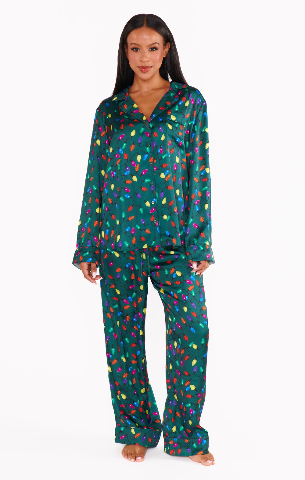 Sleep tight in these super silky button down pajamas! Sold as a set, these festive printed pjs have a drawstring and elastic waist.