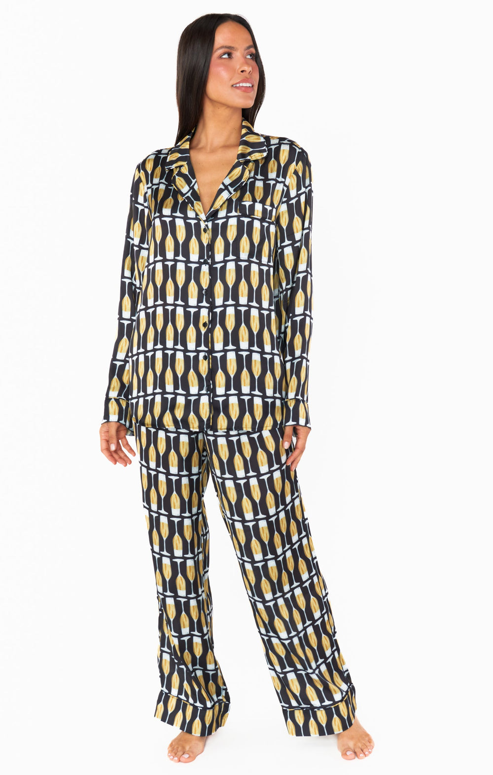 Sleep tight in these super silky button down pajamas! Sold as a set, these festive printed pjs have a drawstring and elastic waist.
