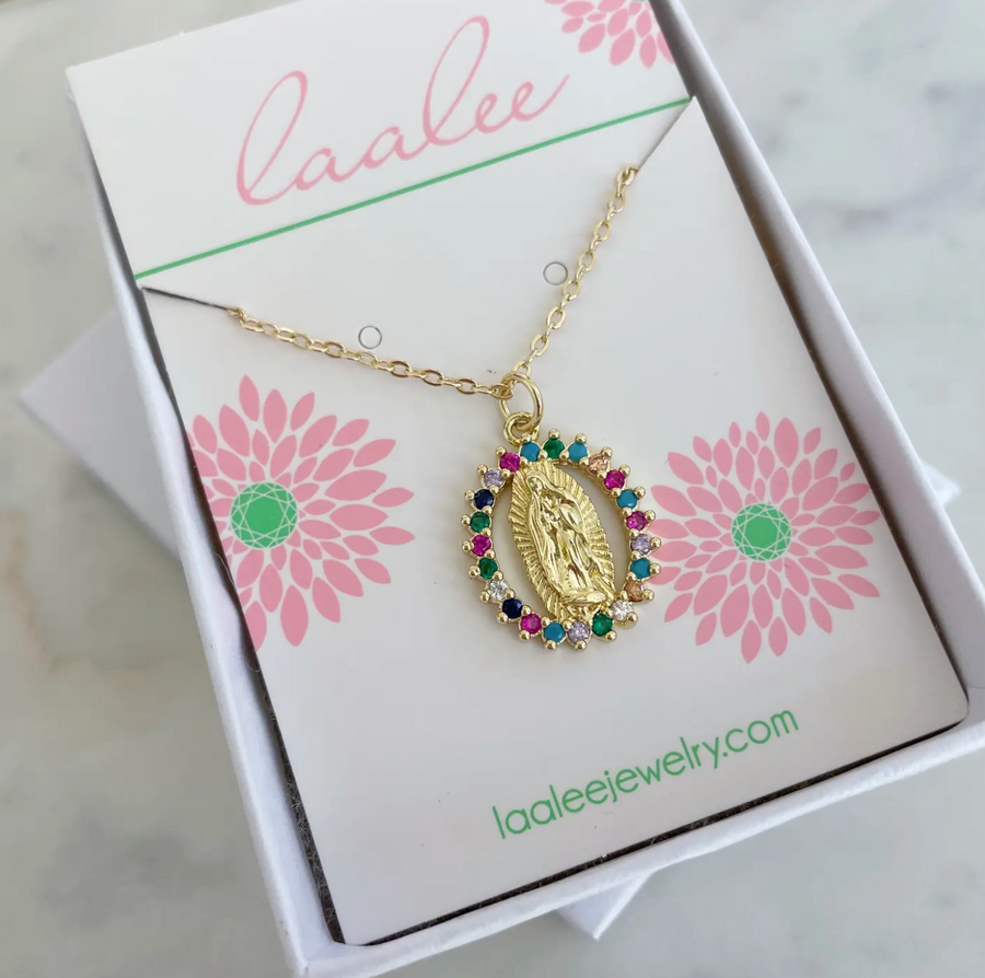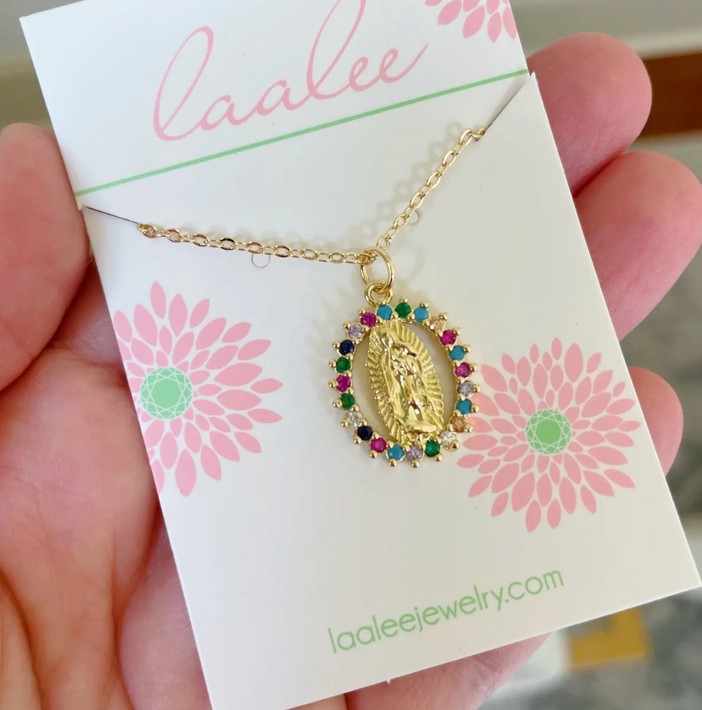 Beautiful Virgin Mary pendant necklace with colorful cubic zirconias surrounding Mary measuring 15x18mm (each necklace varies in appearance with colors). Choose in drop down. Chain, jumprings, and clasp are 14k gold filled. Pendant is 14k gold plated. No nickel. High quality necklace and the perfect gift!