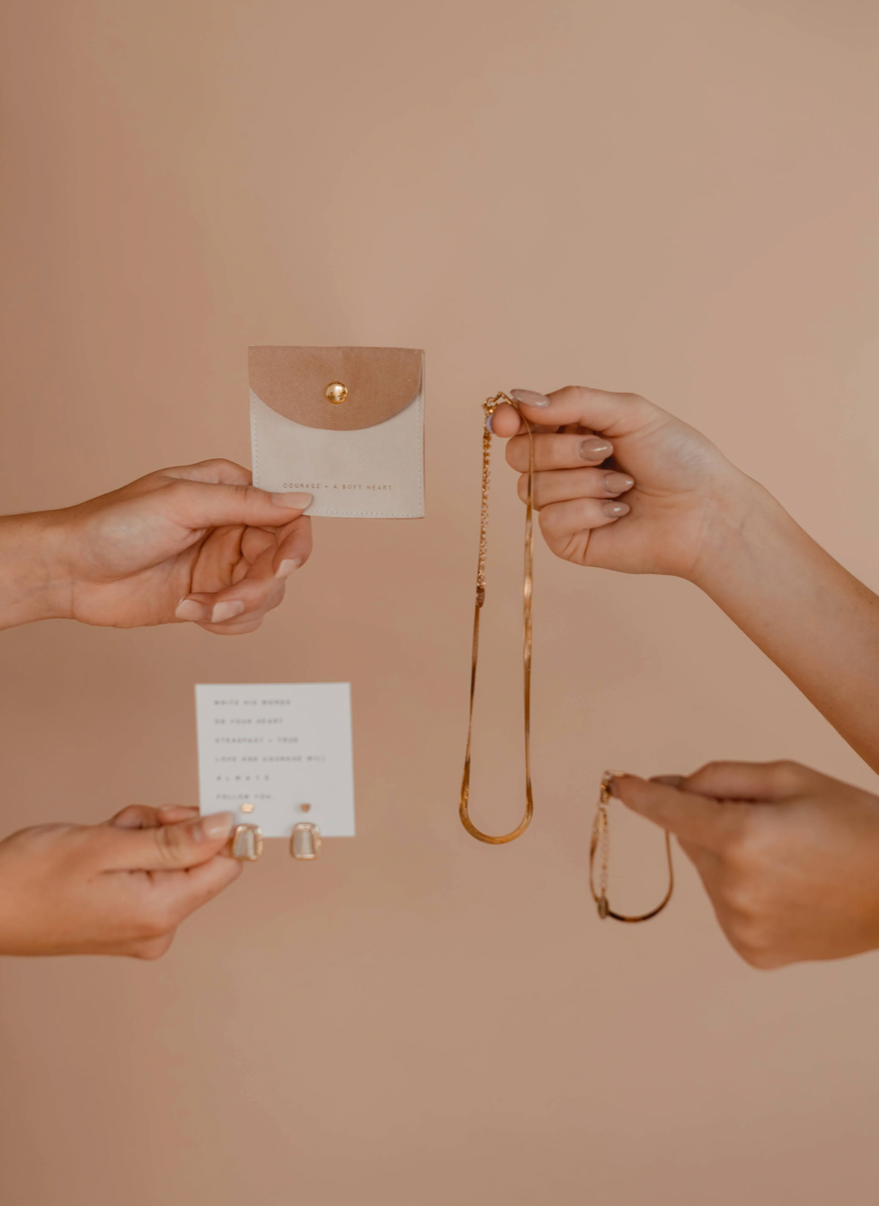 “Let not steadfast love and faithfulness forsake you; bind them around your neck; write them on the tablet of your heart. So you will find favor and success in the sight of God and man.” Proverbs 3:3-4 Details: Tiny tag with verse reference attached to end of necklace 18" adjustable necklace Comes with coordinating pouch + card pictured. 14kt Gold Plated Chain over stainless steel Waterproof, Hypoallergenic, + Tarnish Resistant