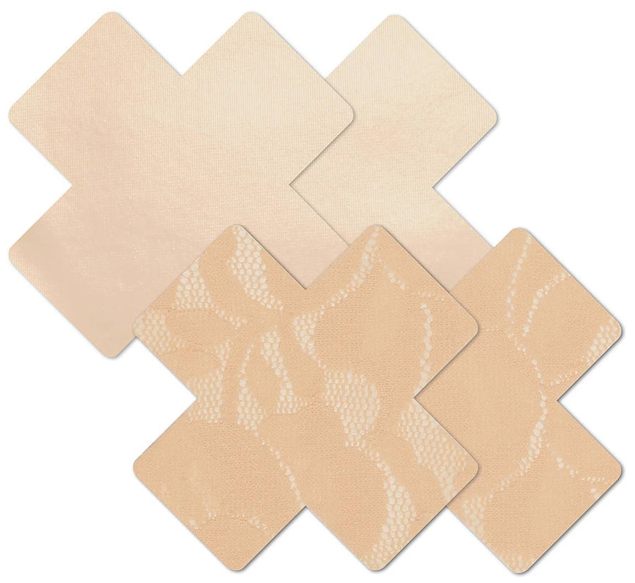 - 2 pairs of disposable nipple covers: 1 pair of creme lace and 1 pair of creme satin cross-shape 4 nipple pads & 2 mini patch tests.