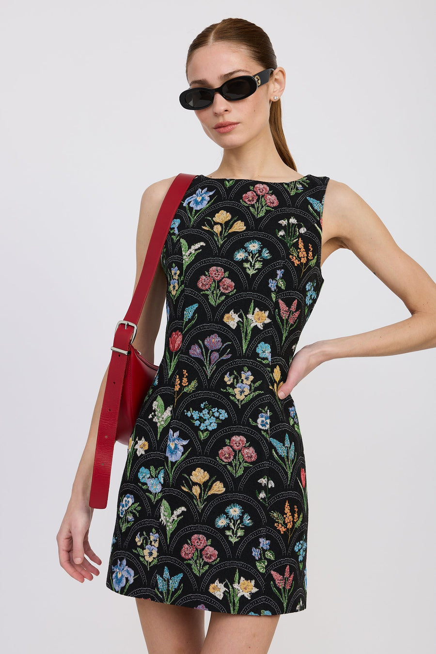 - Boat Neck Fitted Sheath Jacquard Mini Dress