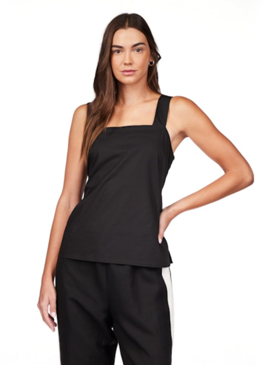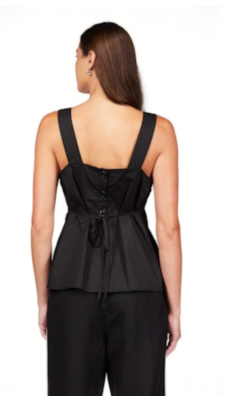 This black tank top features a button-up closure at the back and a waist tie, allowing for a customized and flattering fit.