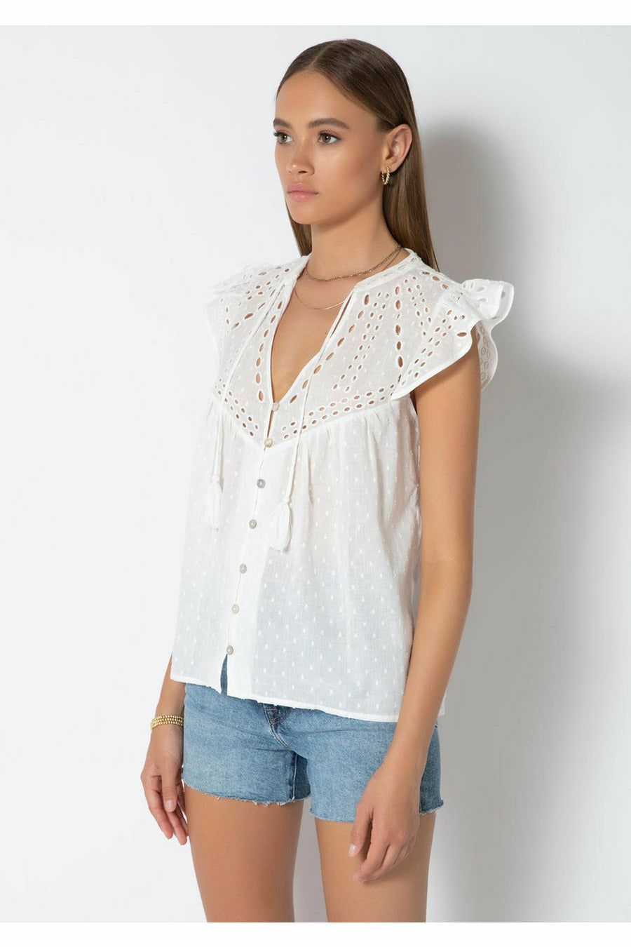 This light and airy top is here to offer the most romantic and refined look. Our Evangeline Top features a relaxed fit, butterfly sleeves and a delightful, eyelet fabric.