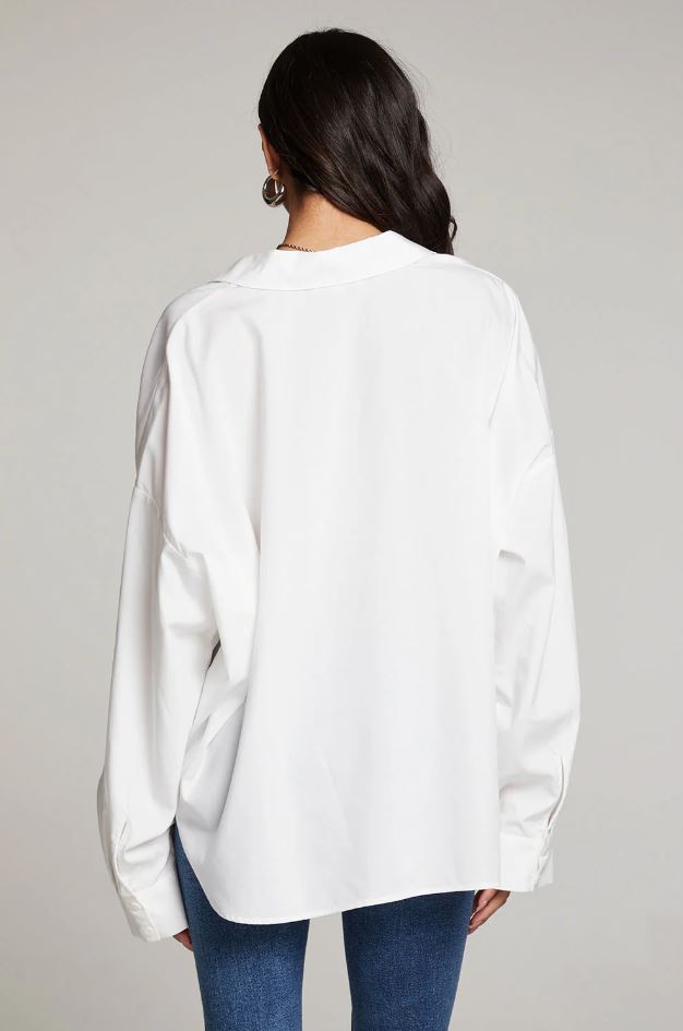 An oversized button up is a style must have, perfect for layering or wearing as is. Pair it with straight legged jeans, or pop on over a dress for effortless gamine style Bright white channels classic menswear chic.