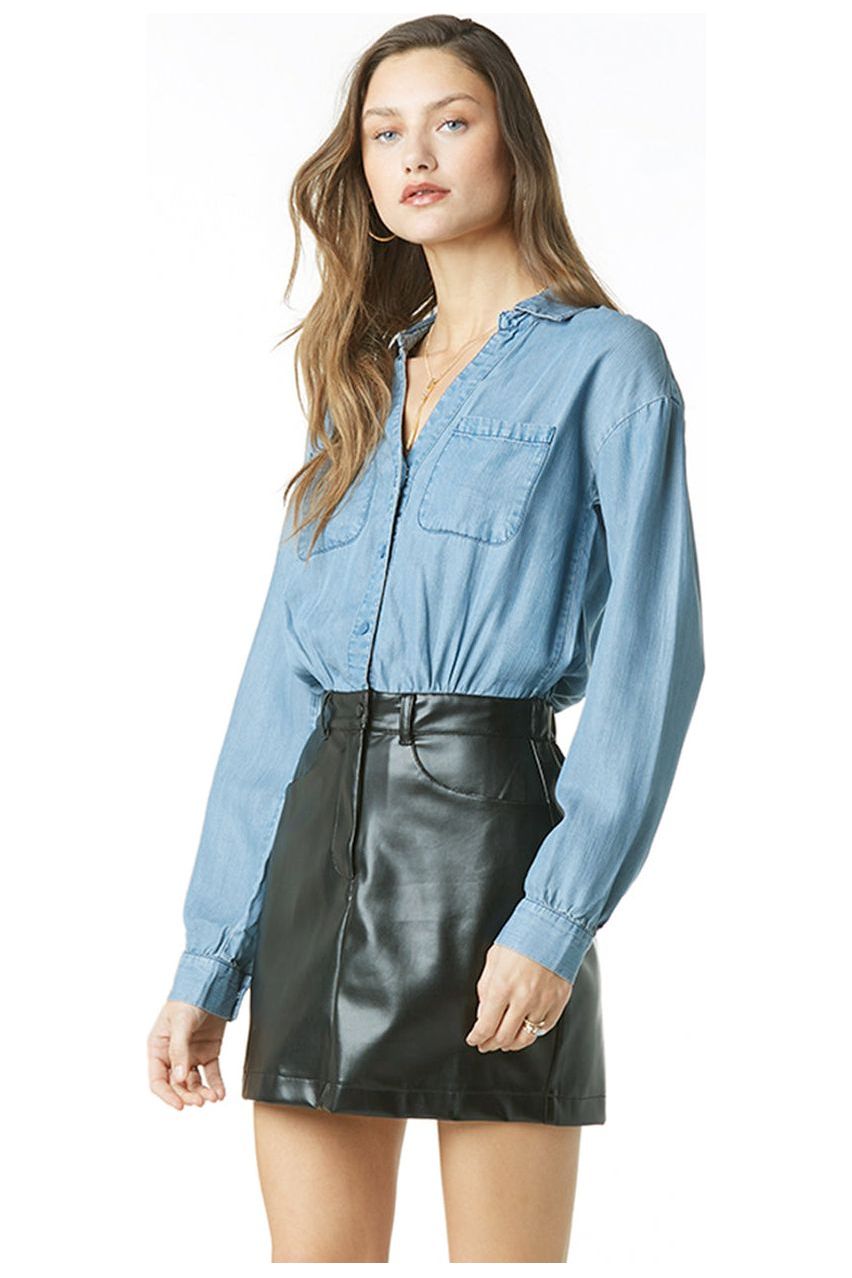 The Faradi Dress is the perfect statement piece for fall. This fun dress features a clever combination of denim and leather that will have you standing out from the crowd. Its unique design and materials give this dress an edgy yet sophisticated look.