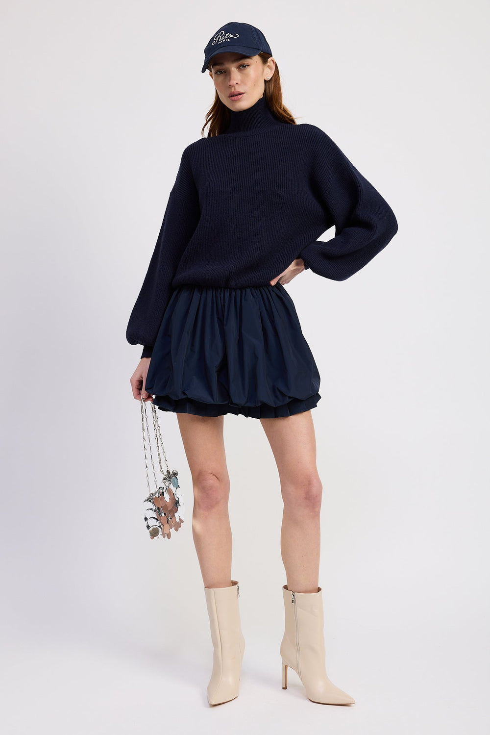 - Turtle Neck Balloon Sleeve Sweater With Bubble Pleat Skirt Mixed Media Mini Dress