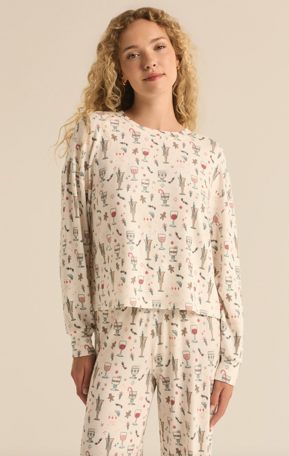 This brushed knit top brings all the vintage holiday vibes with an allover holiday cocktail print for a playful twist. Buttery soft and long-sleeved, it’s perfect for kicking back and enjoying the festive season in total comfort.
