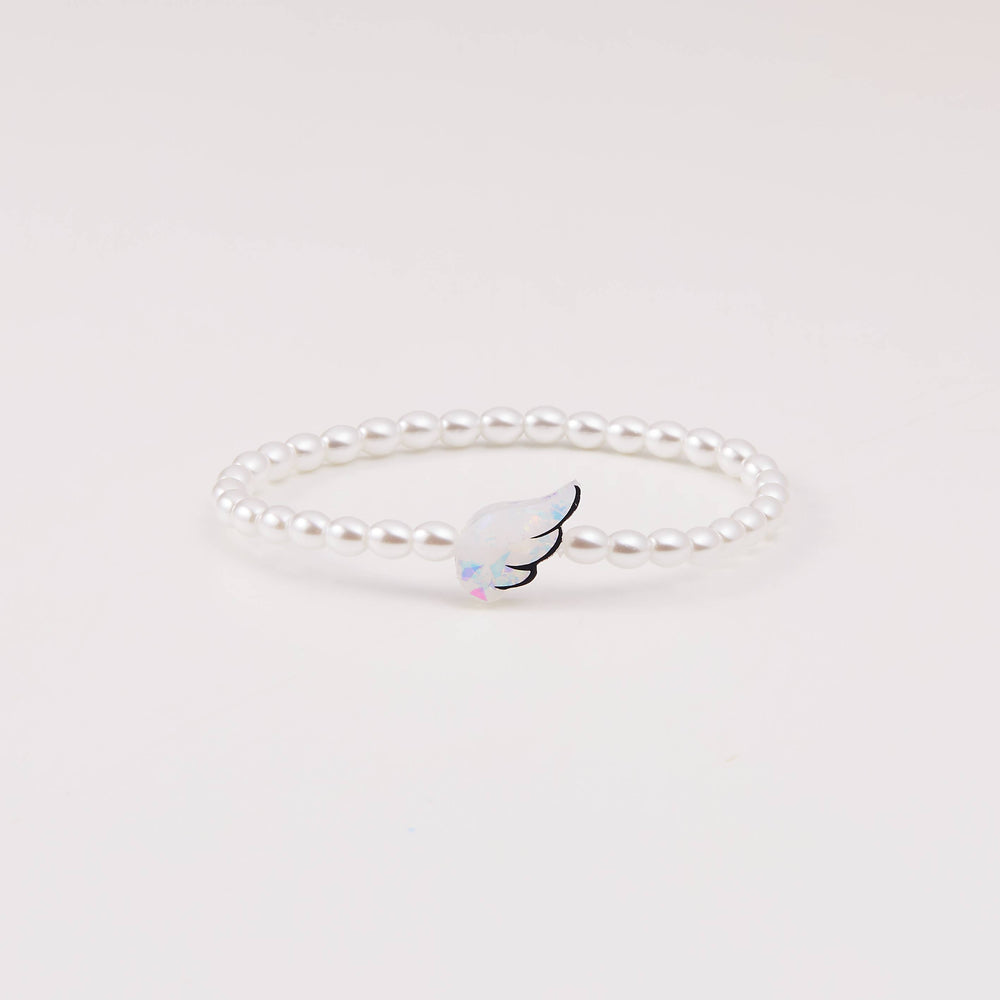 - 4mm crystal pearl beads * Flexible stretch cord * Resin white opal angel wing infused with authentic holy water from Lourdes, France * 6.8 inch unstretched circumference (similar to a regular-sized bracelet) * Water-resistant