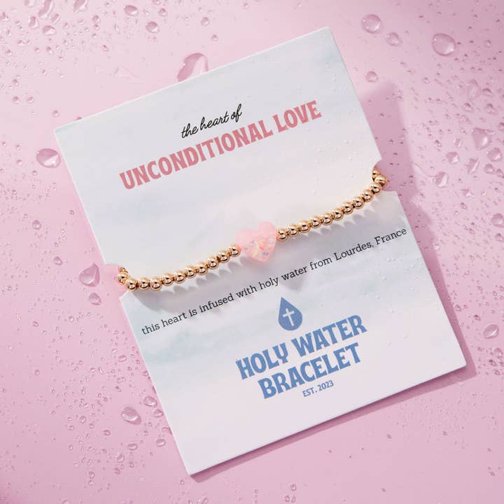 A timeless symbol of unconditional love but with a special touch, each resin heart features is infused with authentic holy water sourced directly from Lourdes, France. * 4mm waterproof beads * Flexible stretch cord * Resin pink heart infused with authentic holy water from Lourdes, France * 6.8 inch unstretched circumference (similar to a regular-sized bracelet) * Water-resistant * Each bracelet comes with a 1-year warranty