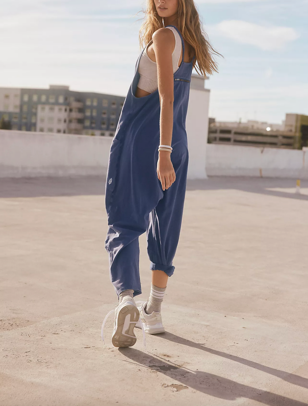 Features: Racerback silhouette, oversized patch pockets, dropped armholes