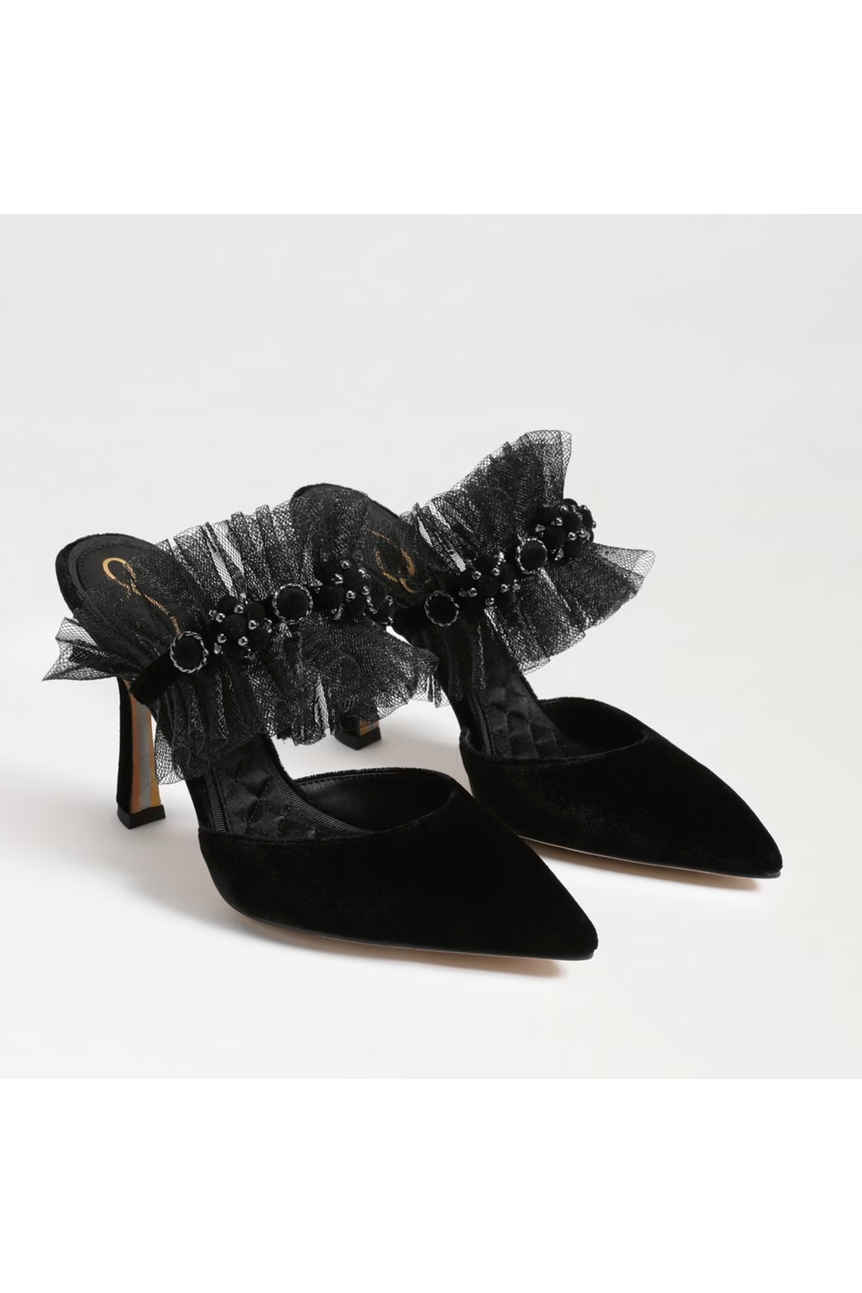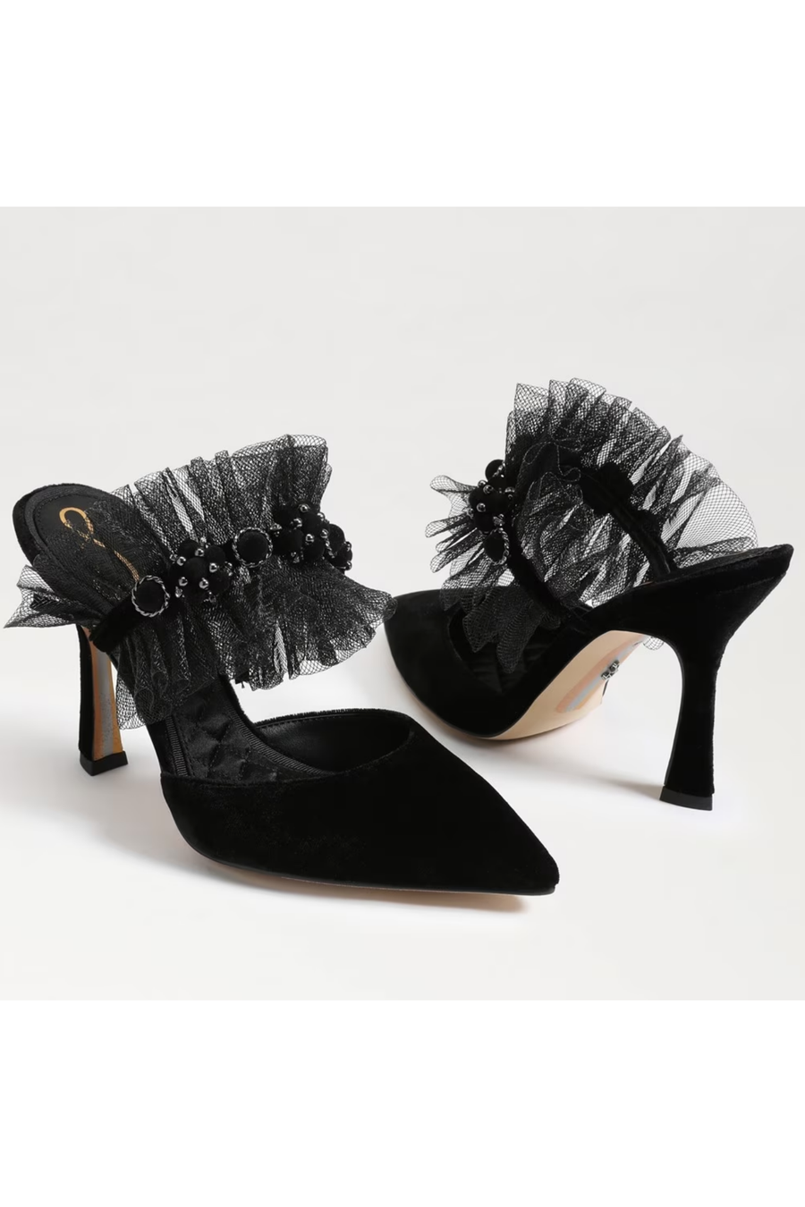 Just when you thought heeled mules couldn't get better, enter: fun tulle textures and sparkling details. This dolled-up pair begs to play with cocktail dresses or ankle-length jeans.