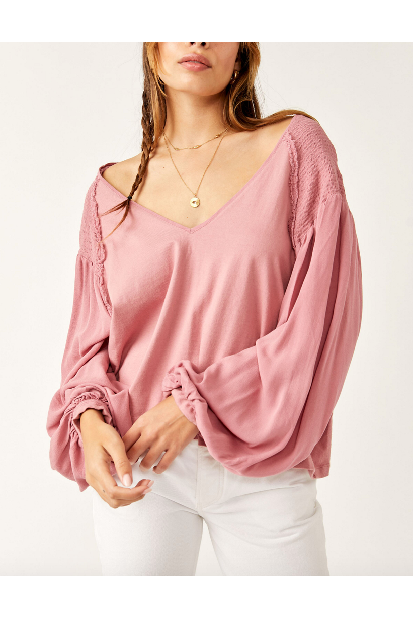 The Kathy Tee is the perfect addition to your fall wardrobe. It features a beautiful blush color, v-neck with cinched shoulders, button closure at the wrist, and blouson sleeves for a boho look. Crafted with great detail, this top will complete any ensemble.