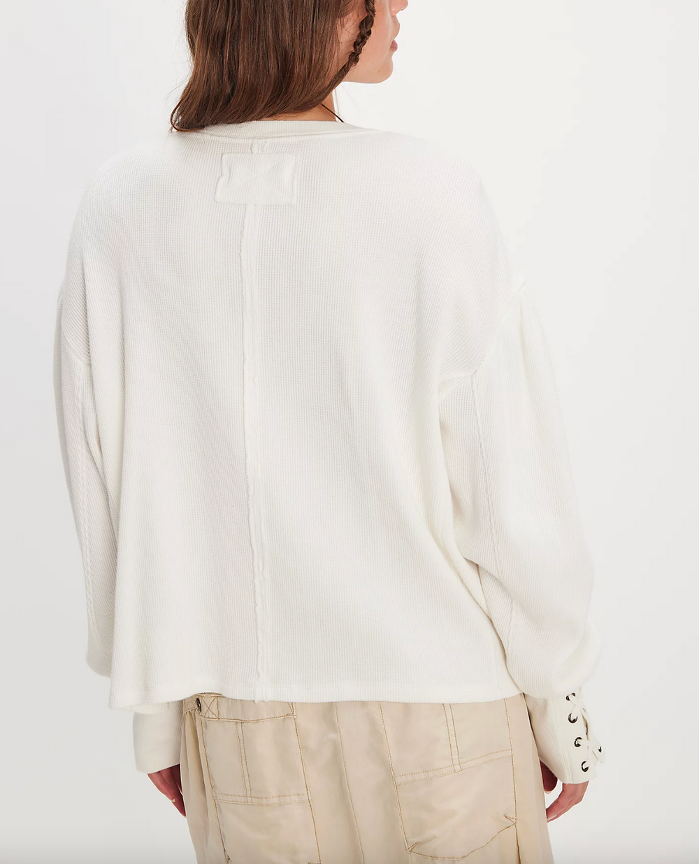 Lace-up details adorn the cuffs of this laidback long sleeve from We The Free, featured in a classic thermal fabrication with voluminous sleeves for added dimension.