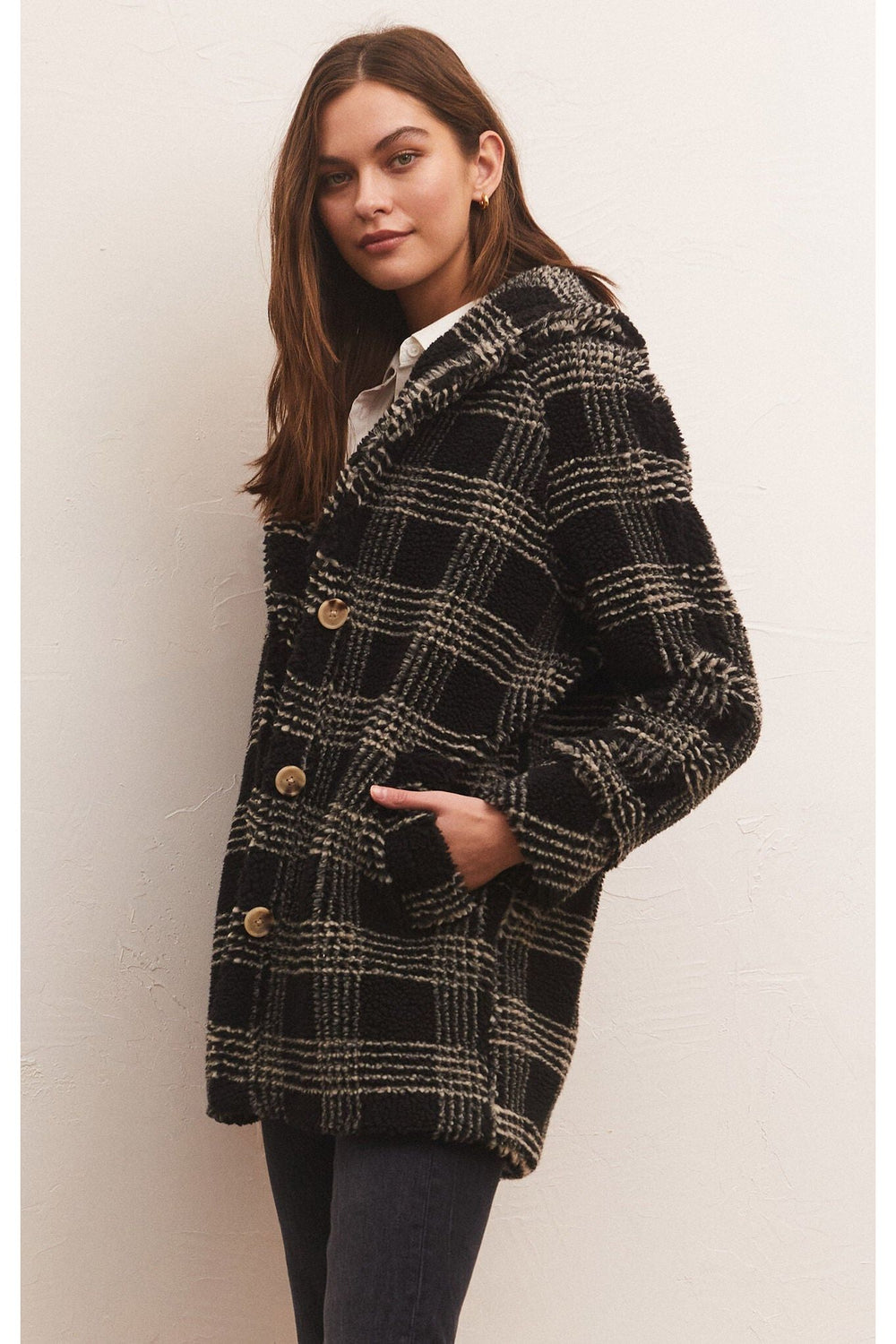 The Hastings Sherpa Coat is made using our Plaid Sherpa fabric and features our yarn dye plaid, a shawl collar, longer length and pockets. There are three buttons on the front, giving the option to be worn open or closed.