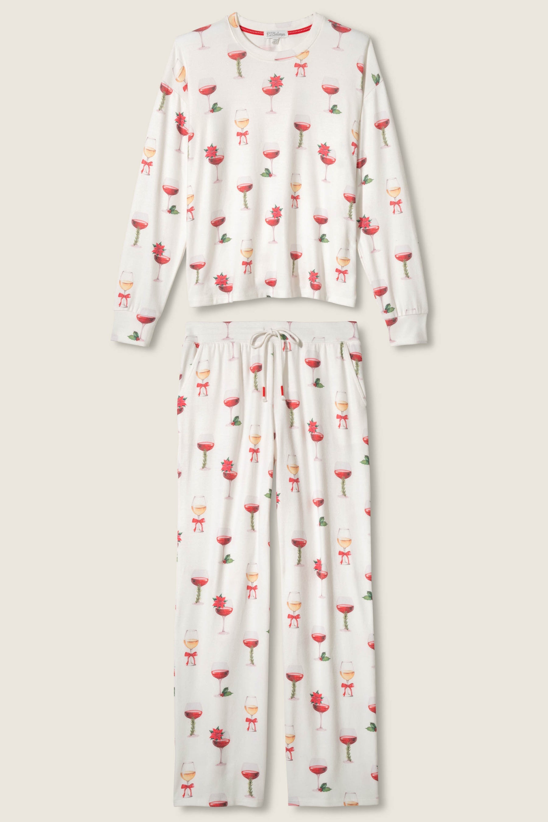 Raise a toast to cozy season in this ivory pajama set, scattered with festive champagne glasses. An instant holiday favorite for cozy nights in and festive mornings alike.