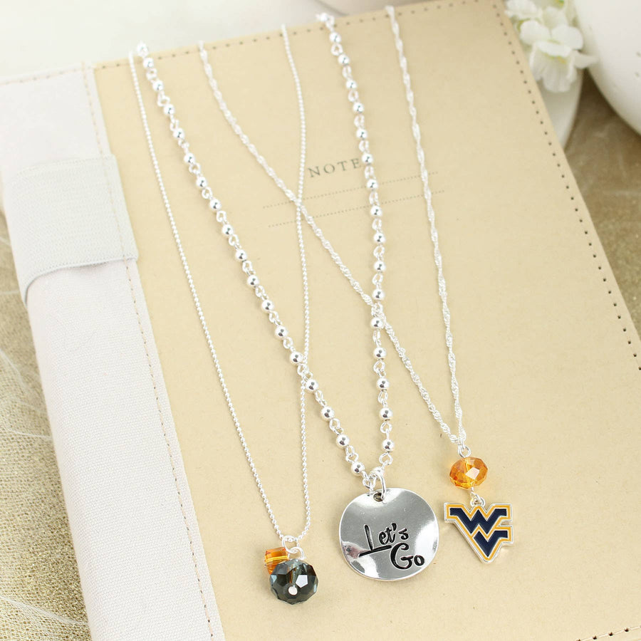 Set of three silver plated 16” necklaces (each with a claw clasp and 3” extender). Each necklace features a different chain style and charm, to include navy blue and golden beads, a navy blue and golden enamel enamel West Virginia logo charm, and a silver plated stamped disc featuring the “Let's Go” slogan. This is an officially licensed product.