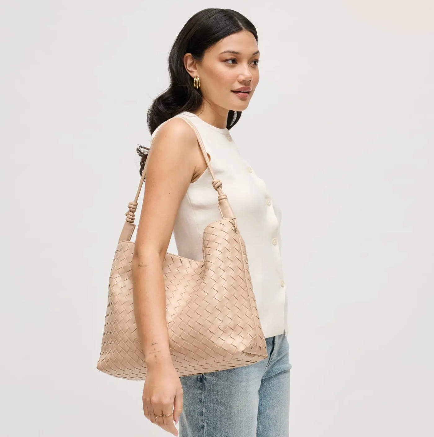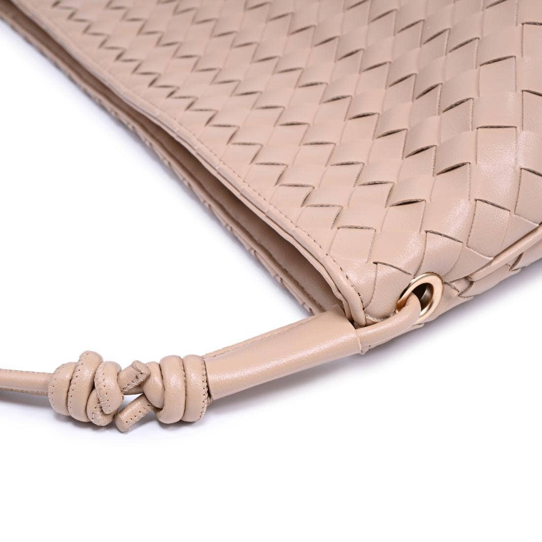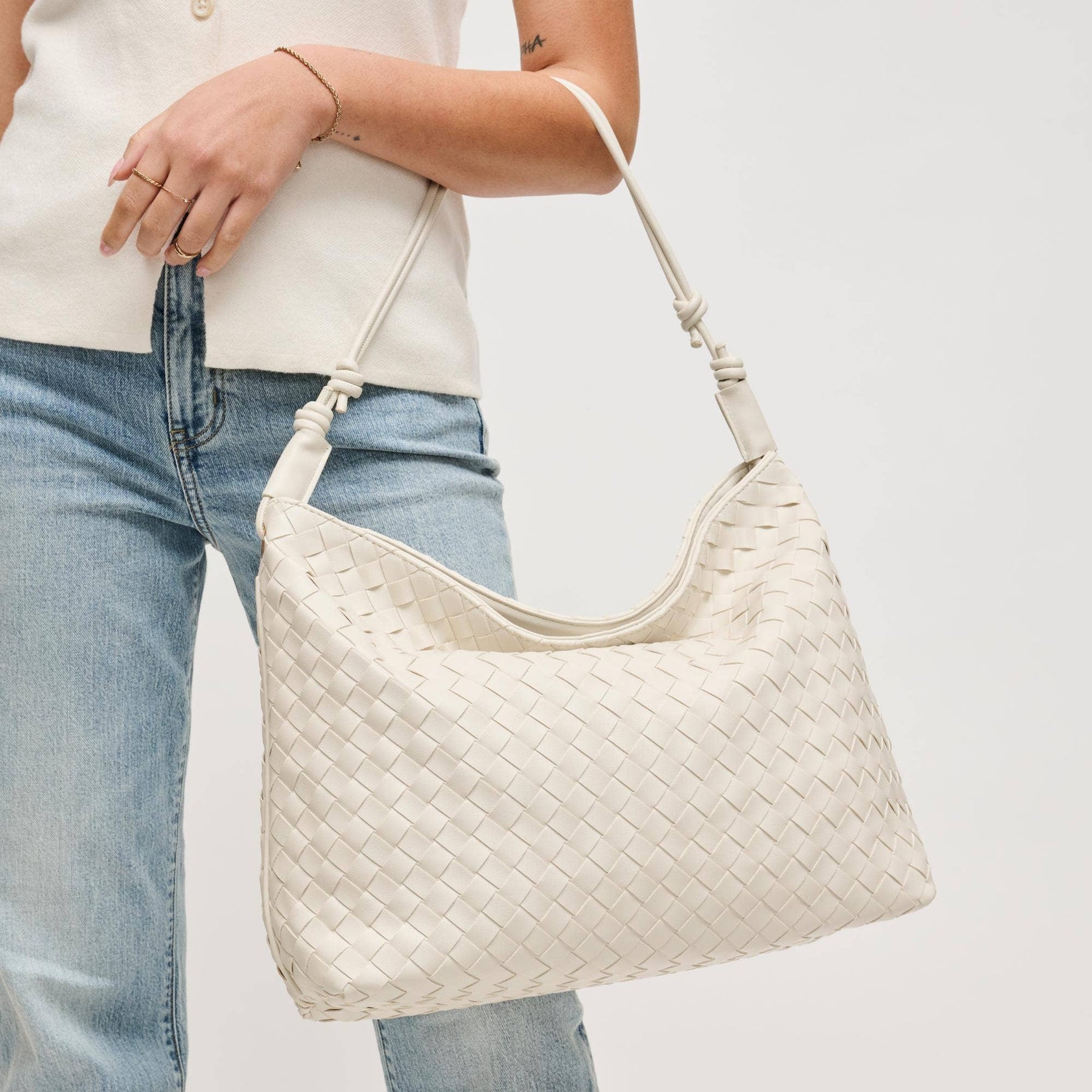 Theo Hobo — slouchy woven silhouette with knotted shoulder detail. Sleek hobo with supple interlaced texture, roomy interior and comfortable single-strap carry. Ideal for work-to-weekend wardrobes, it holds daily essentials, a tablet and more while maintaining a modern, polished look. Lightweight, versatile and trend-forward, pairs easily with tailored or relaxed outfits. A smart, everyday companion for women who want contemporary design and practical function. *Item Type: Hobo *Material: Vegan Leather