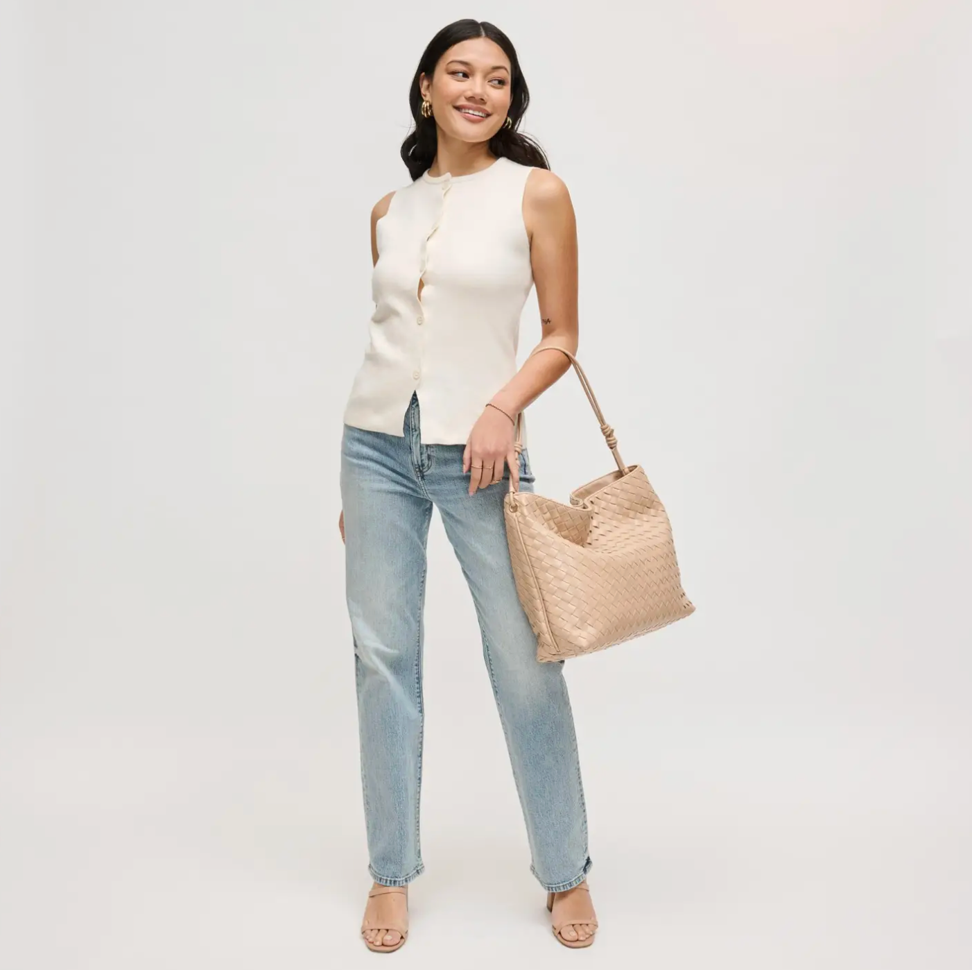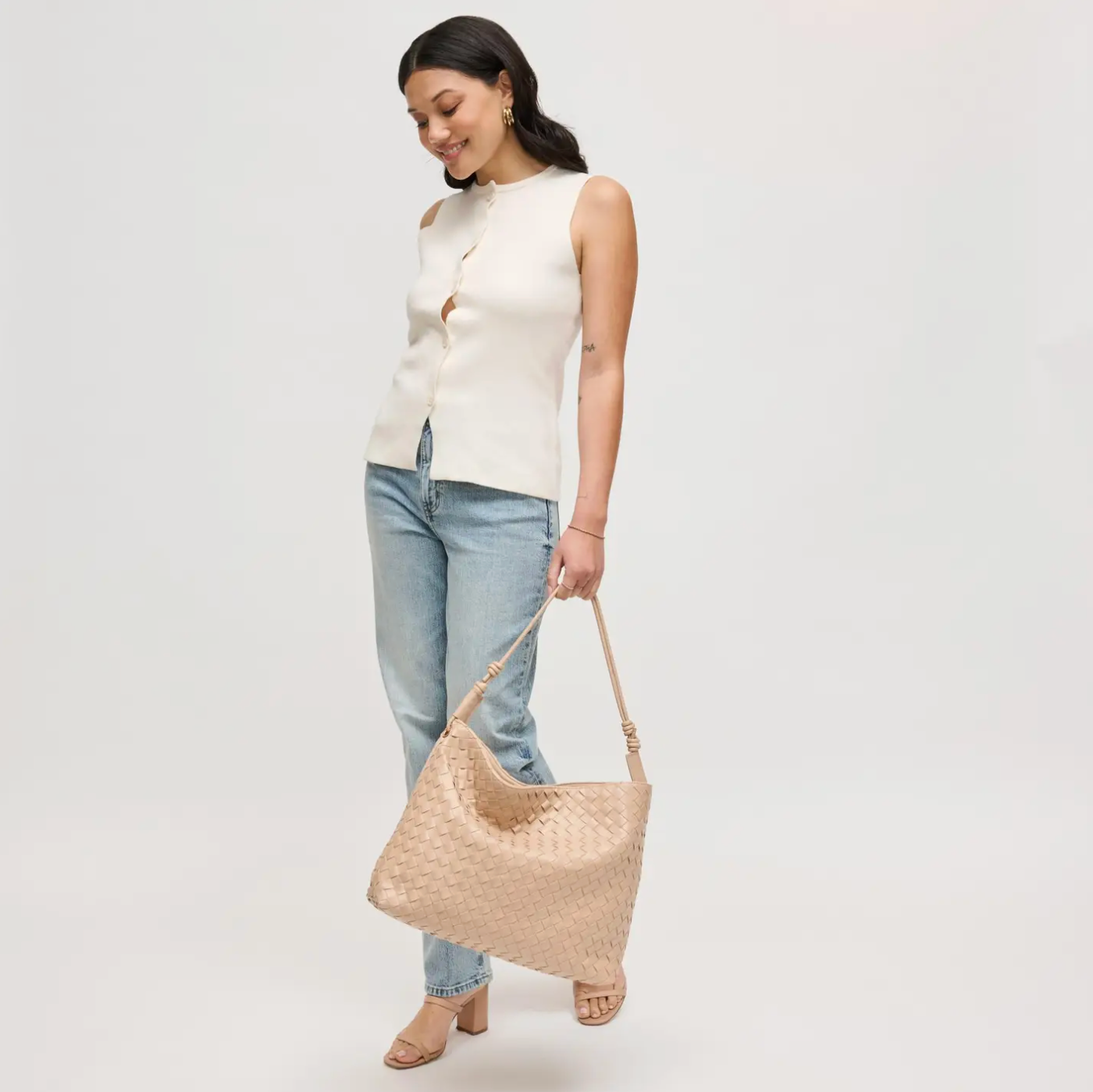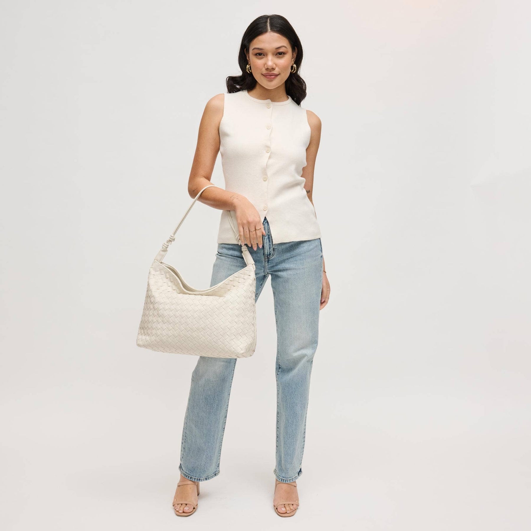 Theo Hobo — slouchy woven silhouette with knotted shoulder detail. Sleek hobo with supple interlaced texture, roomy interior and comfortable single-strap carry. Ideal for work-to-weekend wardrobes, it holds daily essentials, a tablet and more while maintaining a modern, polished look. Lightweight, versatile and trend-forward, pairs easily with tailored or relaxed outfits. A smart, everyday companion for women who want contemporary design and practical function. *Item Type: Hobo *Material: Vegan Leather