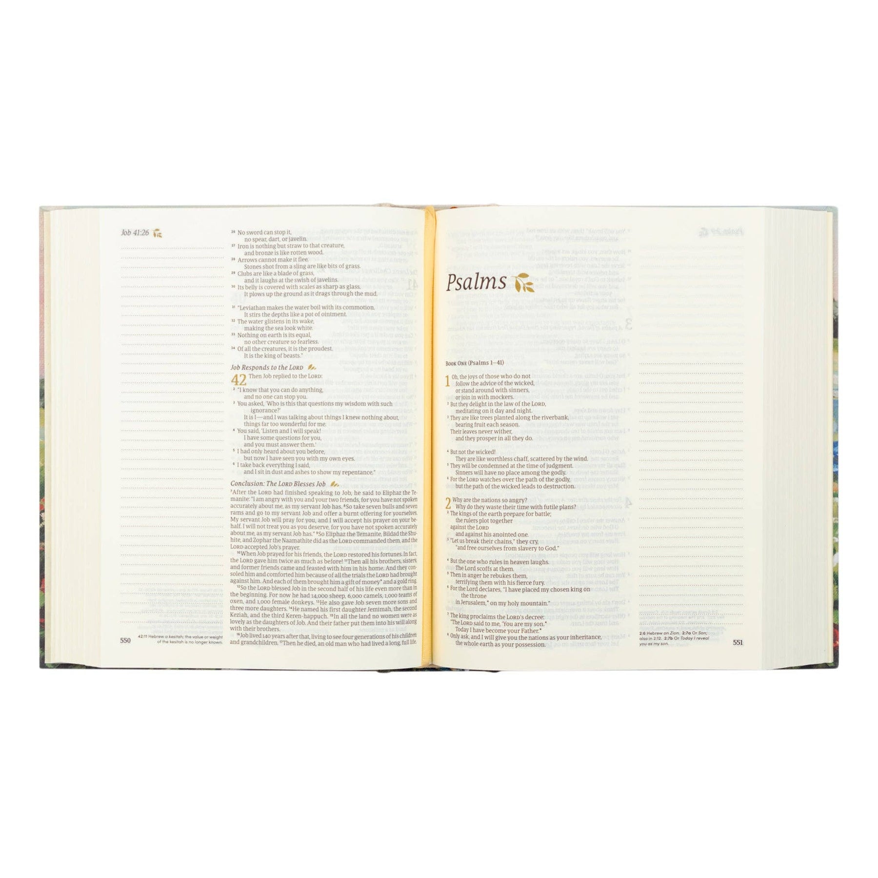The words Coram Deo mean “in the presence of God”—this is where we all long to be! This intricate landscape was inspired by Coram, Montana, near Glacier National Park. With rolling flower fields and a spacious sunset, this Bible reminds us of God’s captivating creation and beckons us to return to his presence. Our hope with every design we create is just that—to inspire you to run to the Father where you are deeply known and forever loved. Product Details - Translation: New Living Translation - Format: cloth-over-board hardcover; with our original Hosanna Revival typeset - Cream-colored Bible paper - Satin ribbon marker - Smyth-sewn binding - Font size: 8pt - Page count: 1,376 - Dimensions: 8.5” x 6.75” x 1.75” - Weight: 41oz