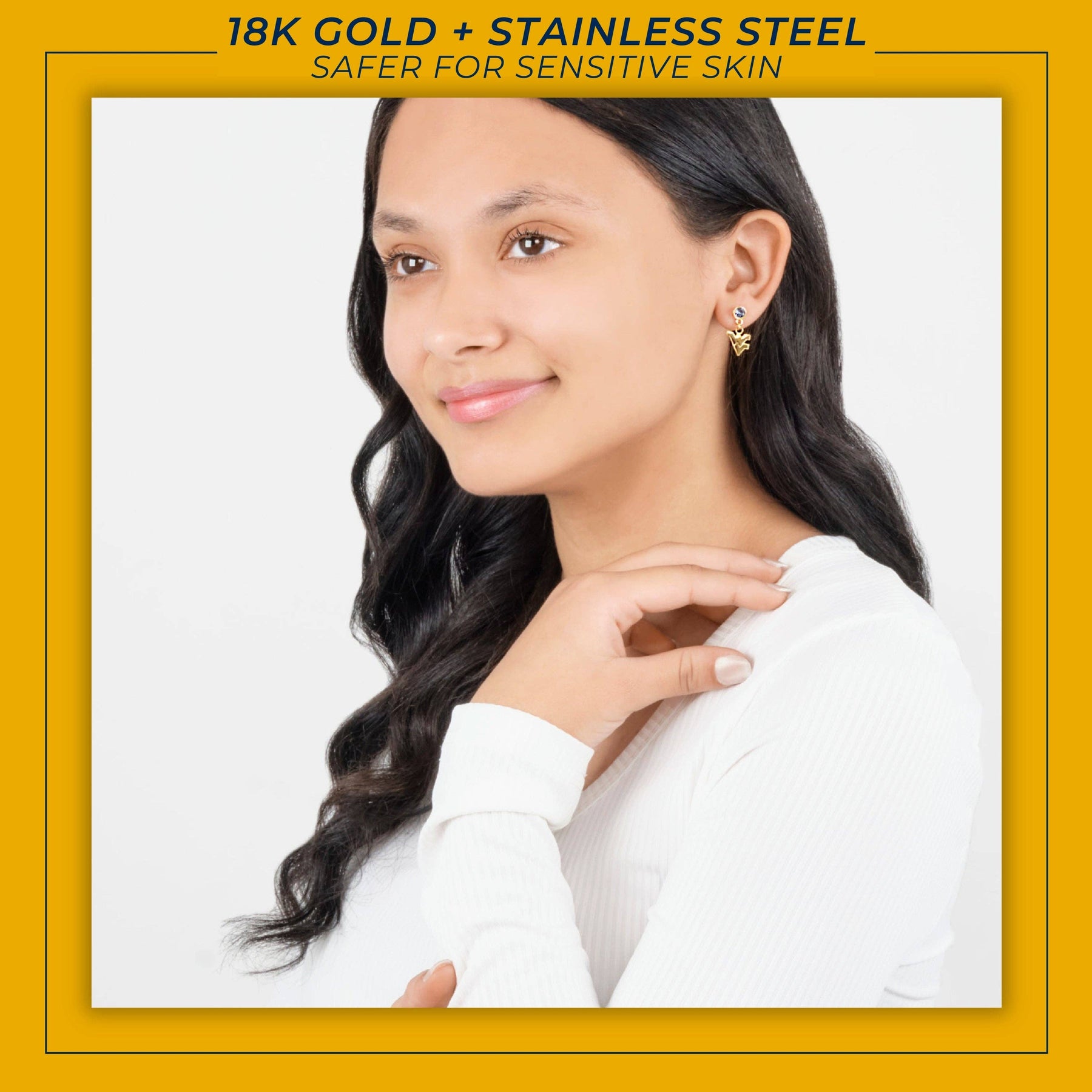 Stone Armory's West Virginia gold dangle earrings for women are here! Gear up for game day with our beautifully designed West Virginia Mountaineers earrings. Wear them to your next tailgate or around town to show off your West Virginia University pride. These WVU womens earrings would also make the best college gifts for your favorite West Virginia Mountaineers fan! The gold plated West Virginia logo is accented by sparkling navy blue crystals. Stone Armory's WVU jewelry is made of stainless steel and quality 18K gold, making these NCAA West Virginia drop earrings the perfect WVU gifts to celebrate West Virginia graduation, birthdays, Mother's Day, first day of school, the first West Virginia football game, or for everyday fan jewelry wear. Thank you for supporting our small business! Support Small Business: Stone Armory is a small family business dedicated to bringing the passion of everyday life, the love for our America, its people, its beauty and its culture to jewelry pieces. Our goal is to bring life'
