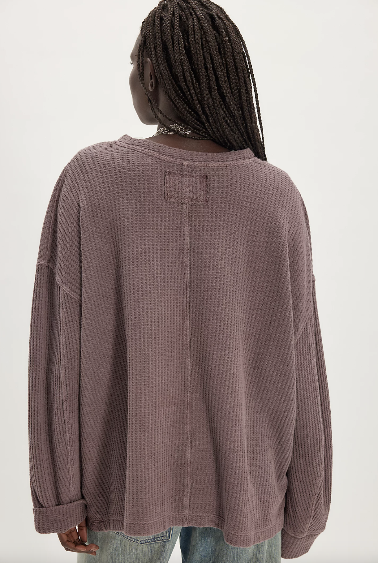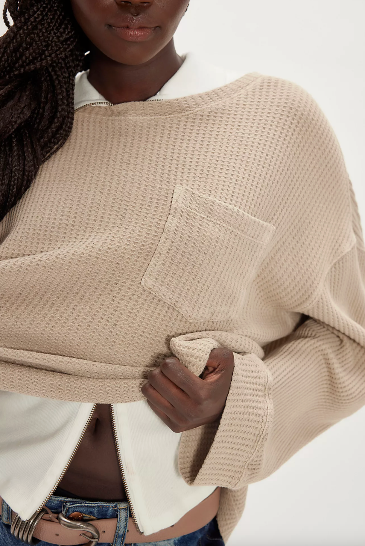 So essential from our We The Free collection, this waffle knit top features soft cotton fabrication, a slouchy, relaxed silhouette, and exaggerated drop shoulders for a go-to comfy staple.