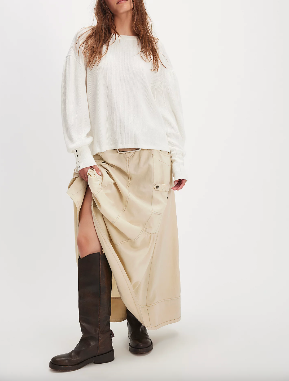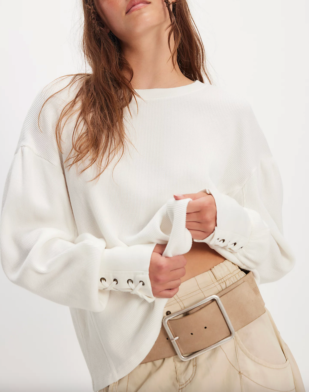 Lace-up details adorn the cuffs of this laidback long sleeve from We The Free, featured in a classic thermal fabrication with voluminous sleeves for added dimension.