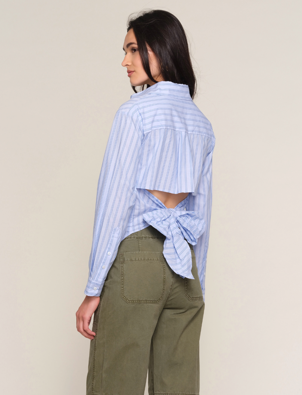 The Timothy Top is your elevated take on a classic button-down, featuring a soft blue stripe and an unexpected open-back detail with an adjustable tie. It’s that perfect mix of polished and playful—easy to dress up, but cool enough for everyday wear.