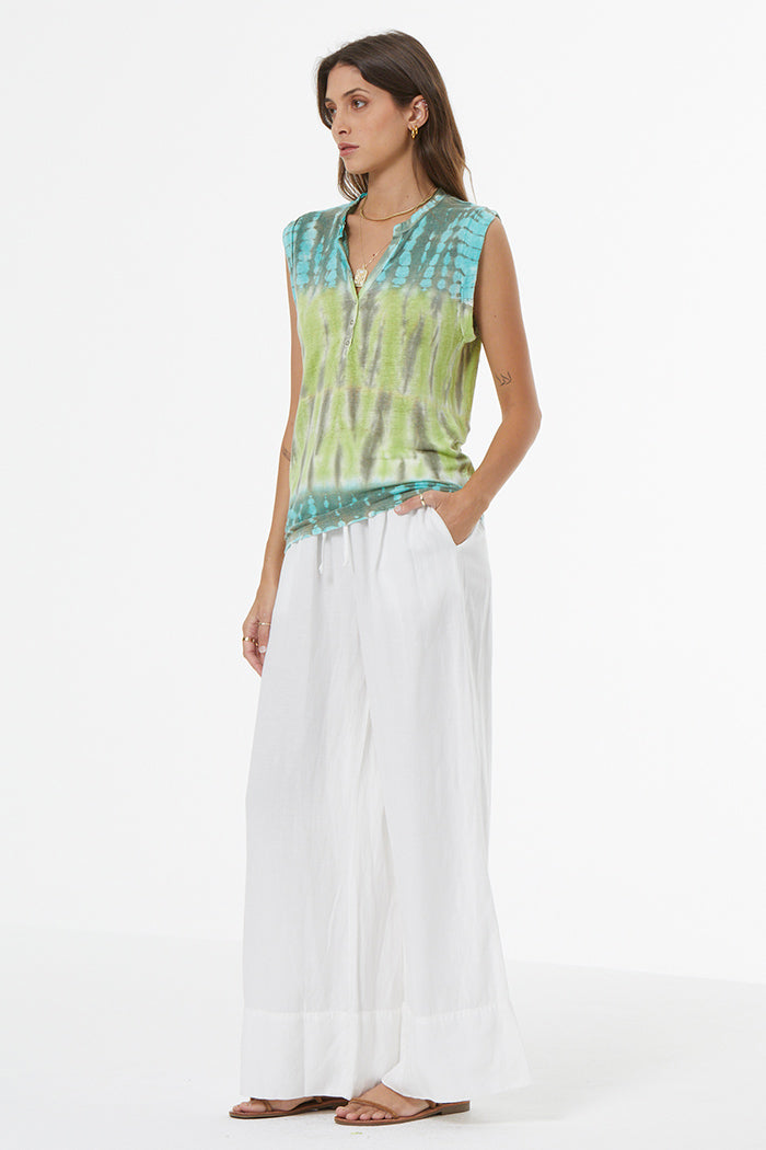 This casual fit silhouette is reimagined in linen for a breezy, textural wear that pairs seamlessly with shorts and skirts.