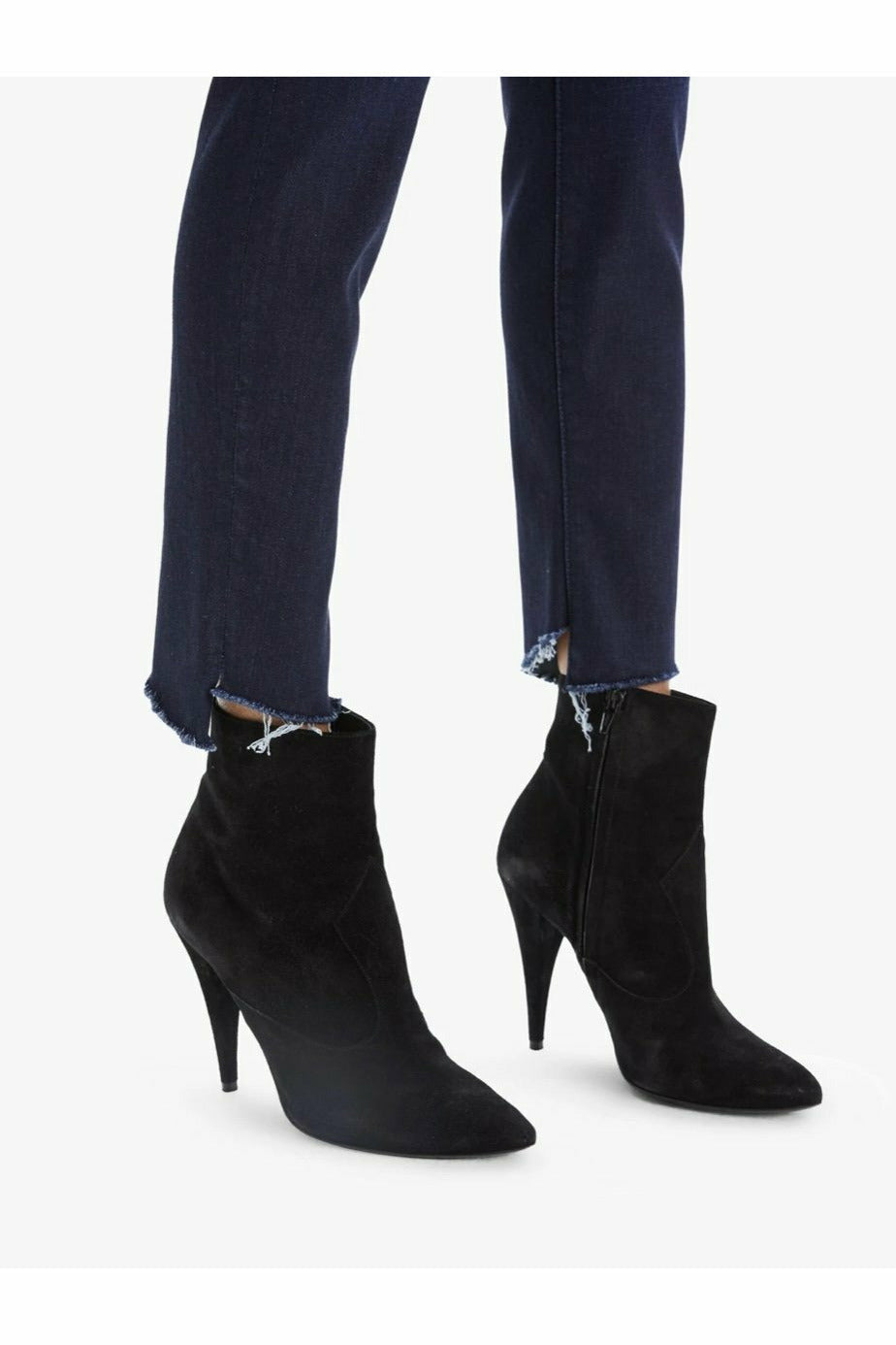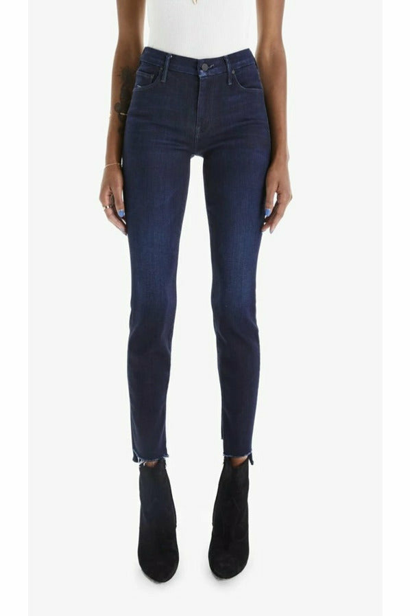Any minute now. MOTHER's cult-favorite skinny with a mid rise, ankle-length inseam and a frayed front-and-back step hem.